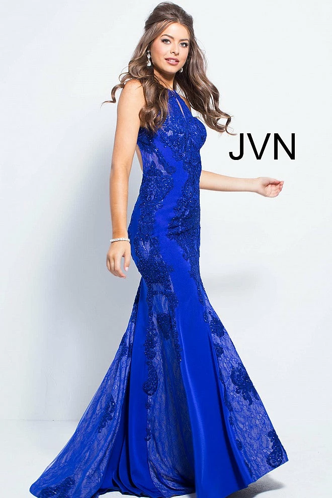 JVN55869Â high neckline with keyhole embellished lace fitted long prom dress with cutout circle in back available in Light Blue, Blush, Royal Blue, Black, Charcoal. JVN 55869 Backless Mermaid Lace Prom Pageant Dress Formal Evening Gown Embellished High Neck Keyhole Cutout gown. JVN by Jovani 55869