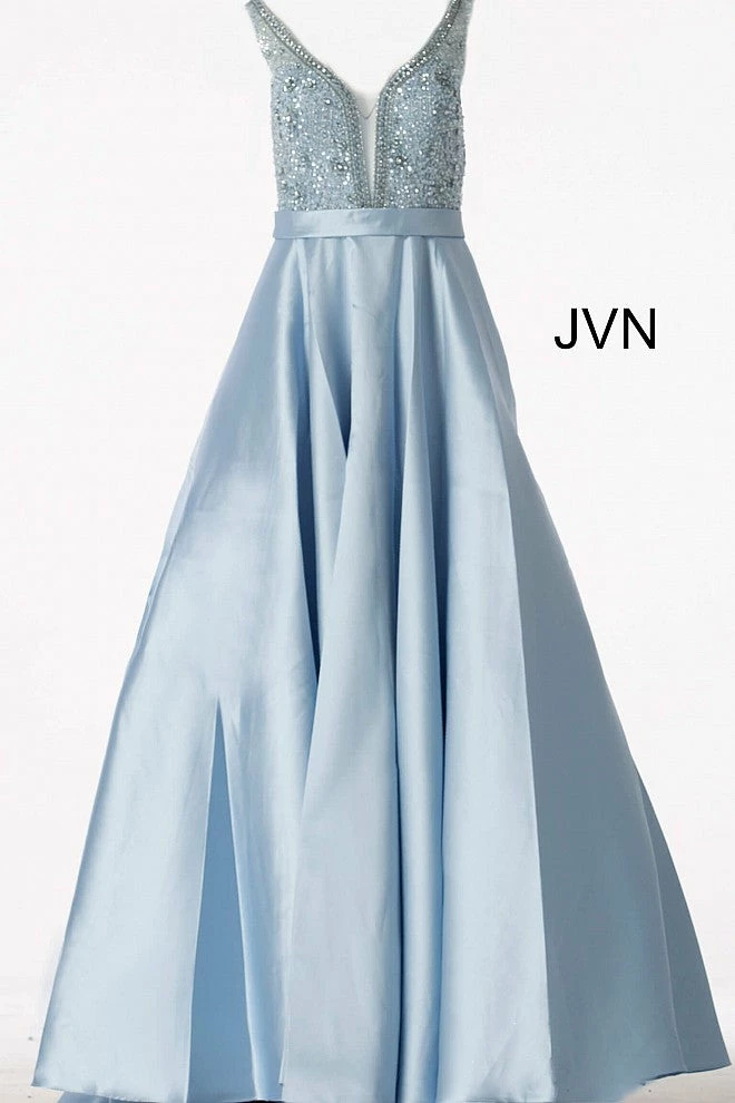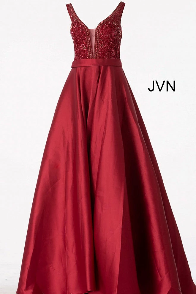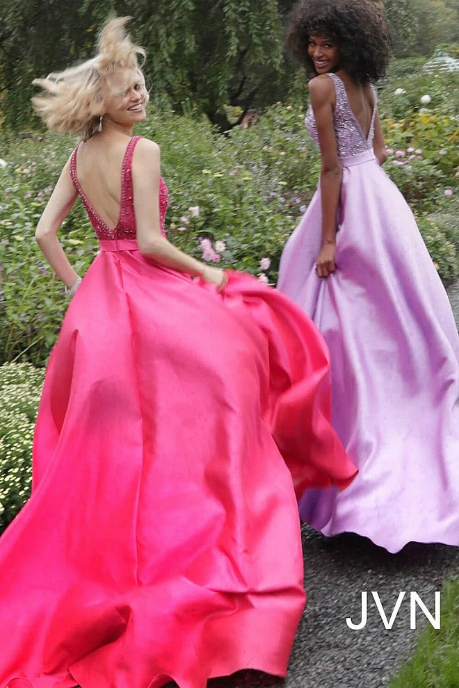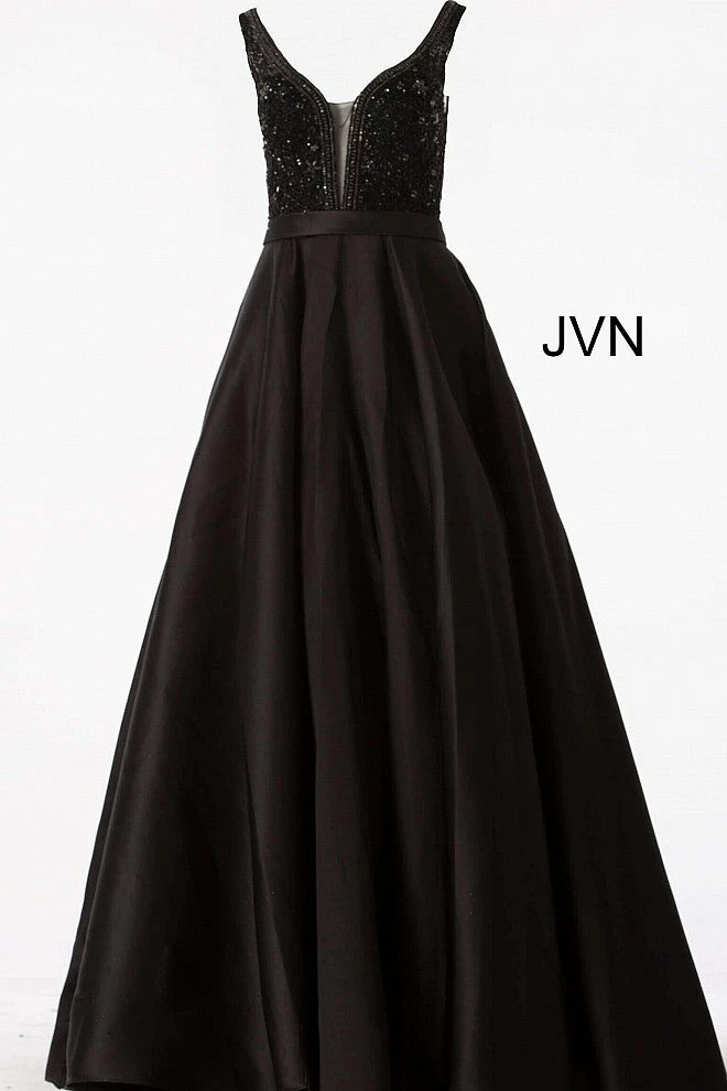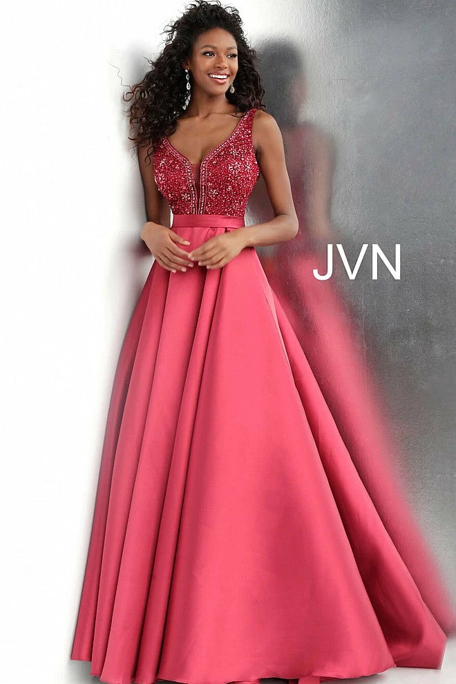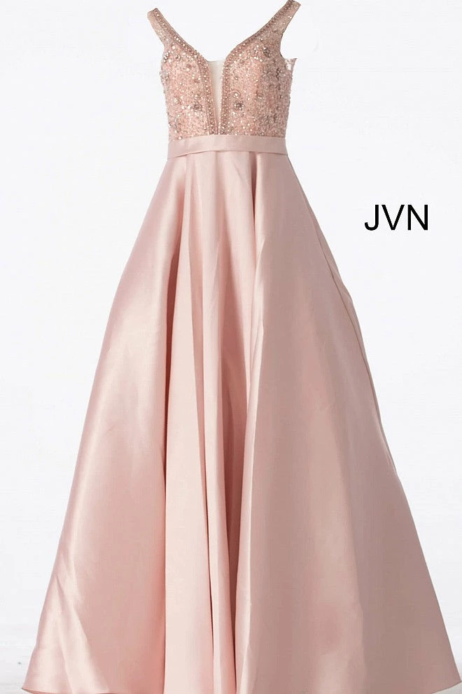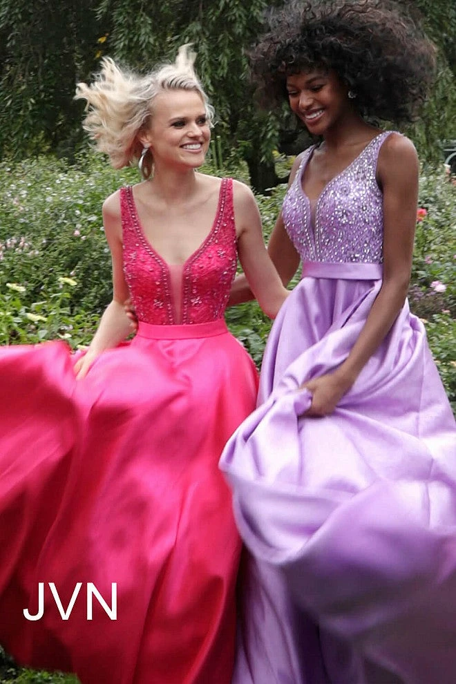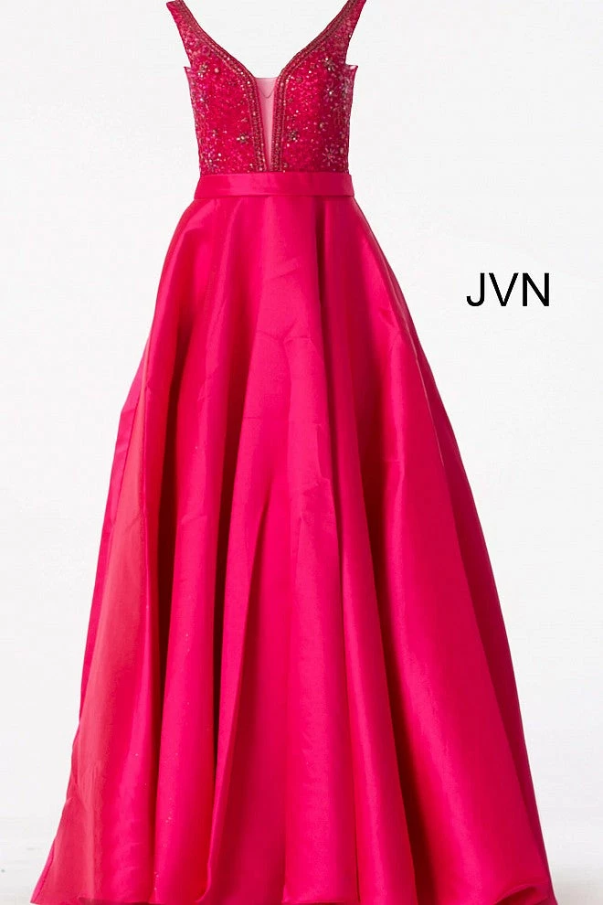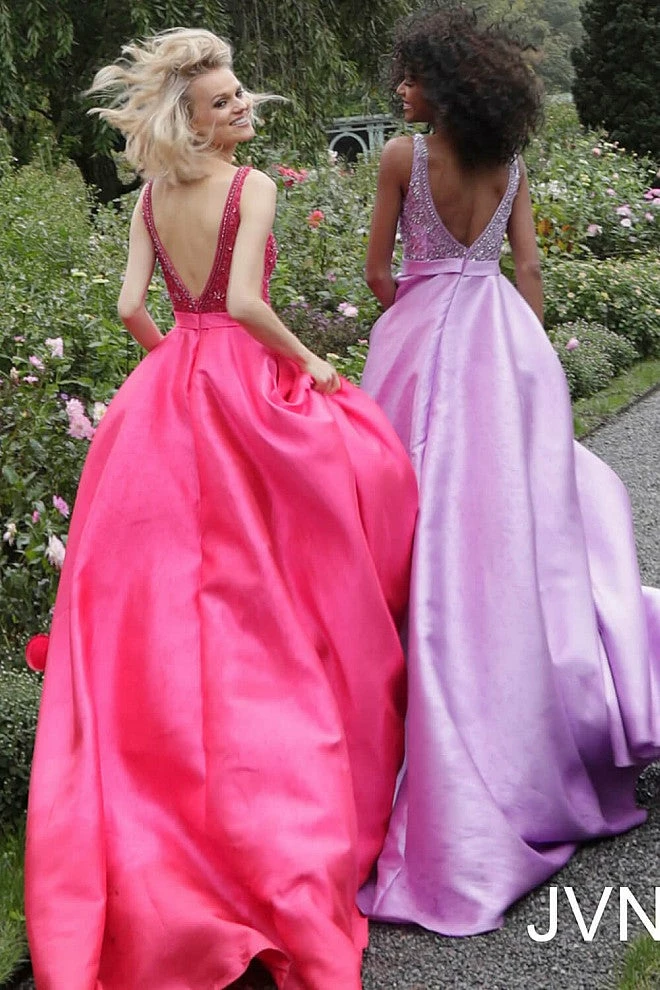 JVN67198Β Beaded Prom Dress, Pageant Gown, Evening Dress fitted bodice, plunging V neck with sheer mesh insert, sleeveless, V back, floor length a line pleated skirt, sweeping train. JVN 67198