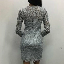 JVN3217 short lace cocktail dress with sheer long lace sleeves and all over lace with fitted skirt and sheer lace back.Β