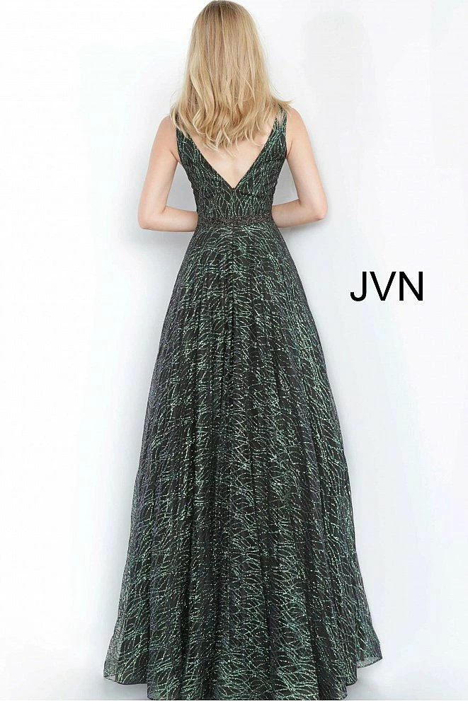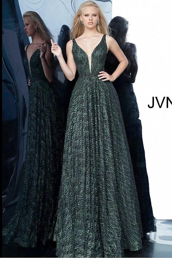 JVN3817 Plunging v neckline with mesh panel A line prom dress ball gown evening dress
