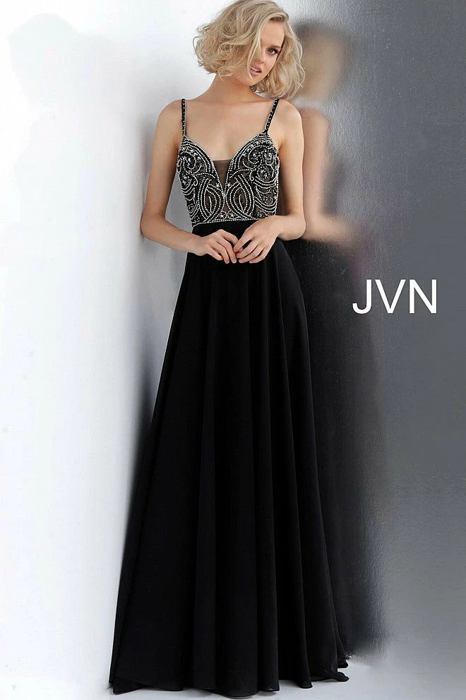 - Details:Β Black embellished chiffon long prom dress with crystal embellished sheer sleeveless bodice, v-neckline, v-back and spaghetti straps, floor length pleated flowy skirt.Β