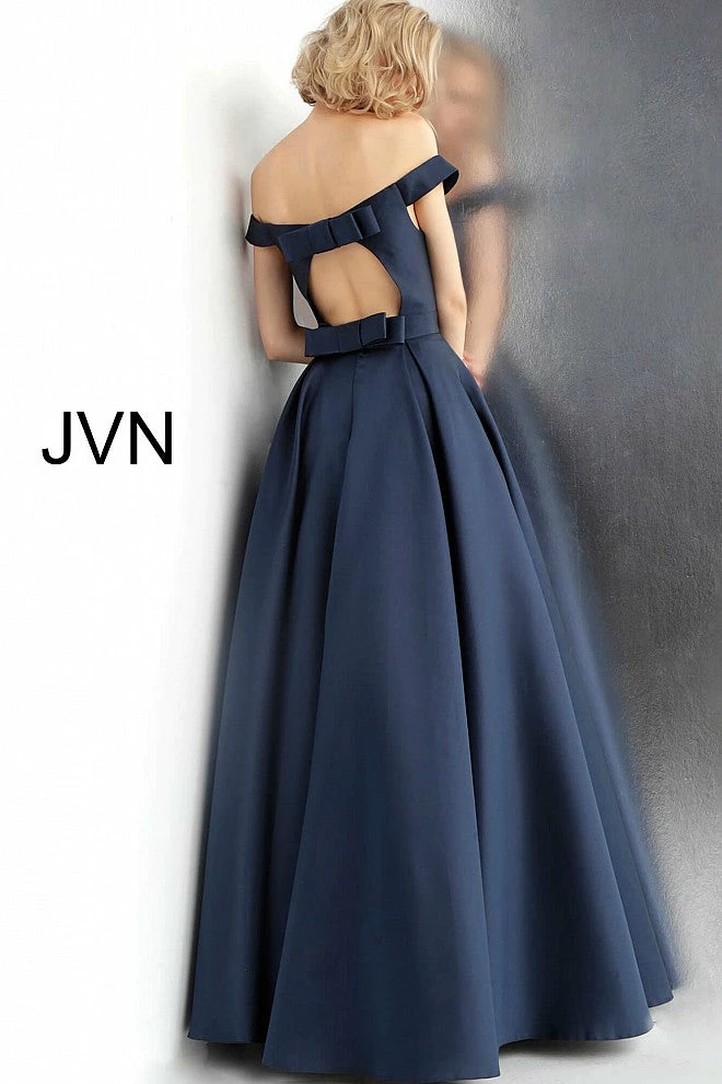 - Details:Β Navy simple a-line prom ballgown with off-the-shoulder fitted sleevelessΒ bodice, straight neckline and cut-out bow detail back, floor length pleated a-lineΒ shape skirt with side pockets.