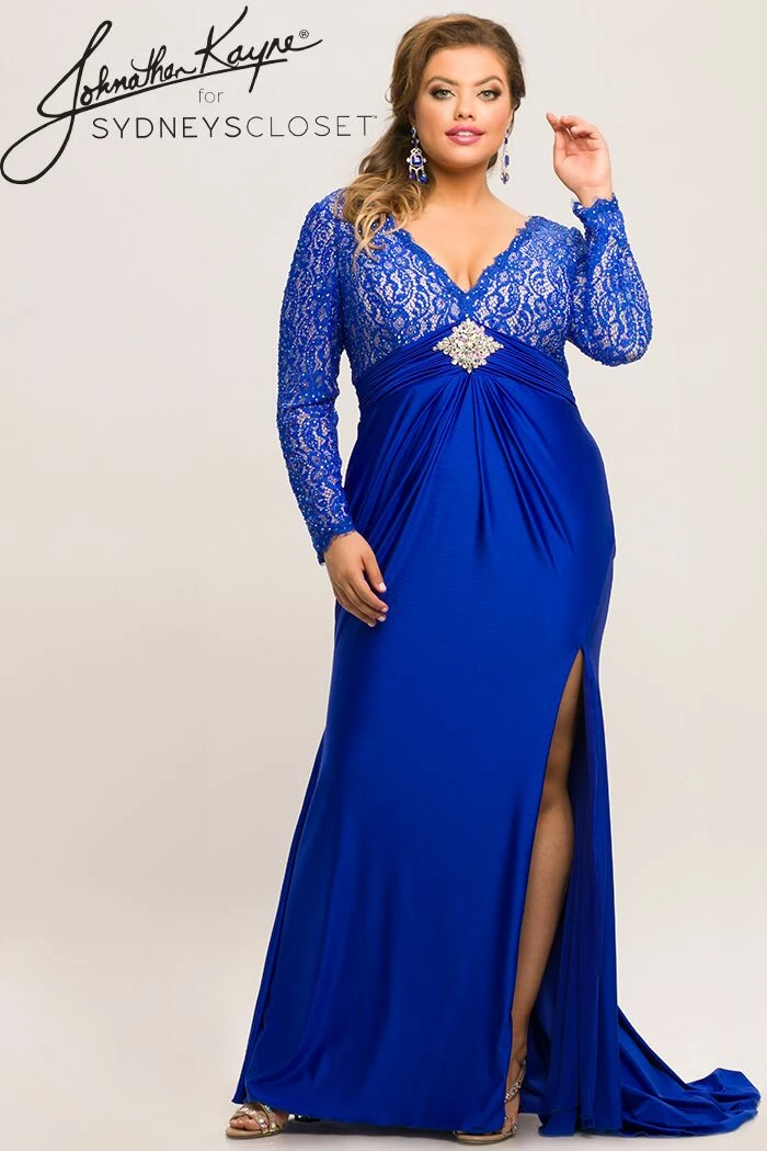 Johnathan Kayne for Sydneys Closet JK2003 Nova V neckline with lace bodice and v back features long sleeves and fitted jersey skirt with ruching at the waistline and side slit.Â