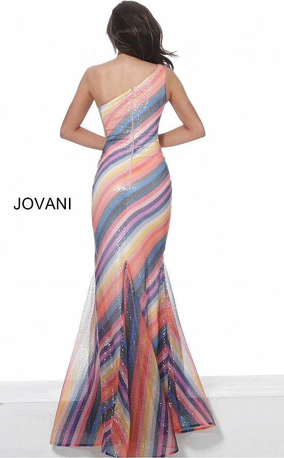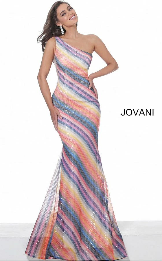 Jovani 05127 Metallic Shimmering one shoulder rainbow mermaid prom dress evening gown Long Fitted Mermaid Pastel Rainbow Dress One Shoulder Formal Gown