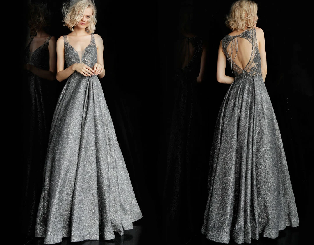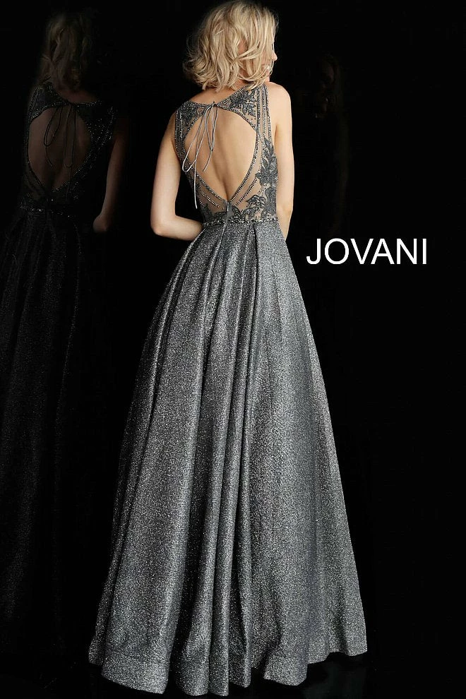 Details: Dark grey embellished long prom gown with sheer sleeveless beaded bodice, bra cups, plunging neckline and open back, glitter flared and pleated a-line skirt.