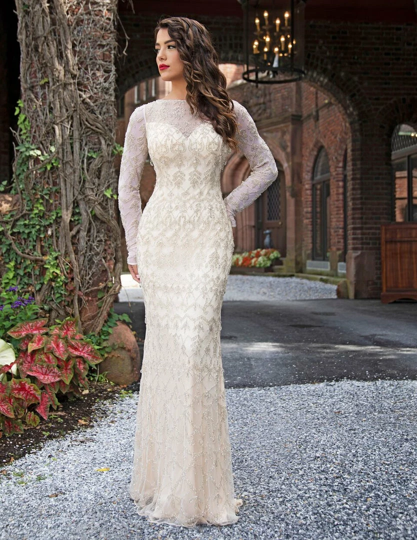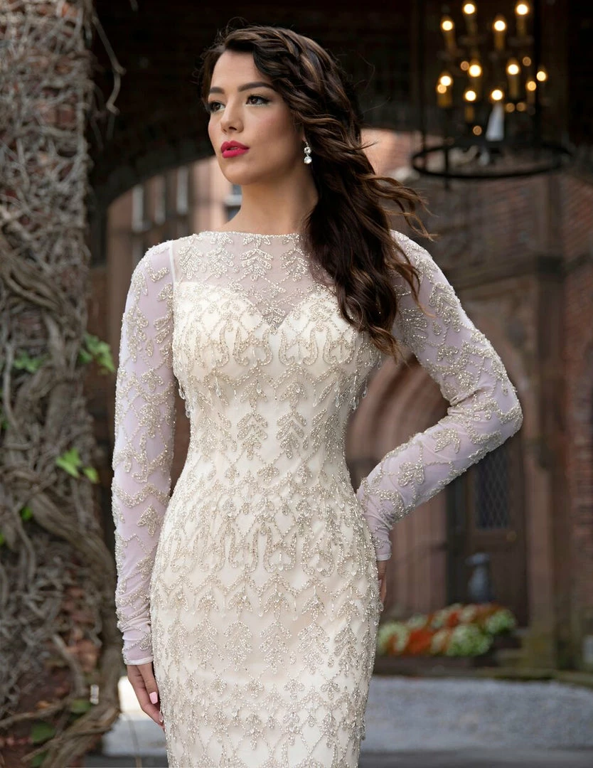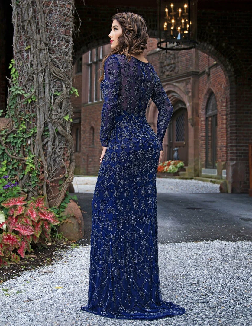 LongΒ sheer beaded sleeves and sheer neckline with beautiful sheer beaded open back long beaded sequin evening gown.