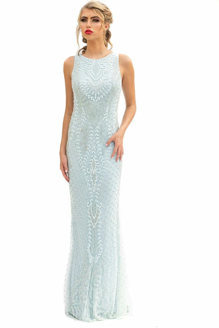A classy prom gown with beautiful designs is sleeveless with a high neckline design.Β Long Column High Neck Formal Dress Evening Gown