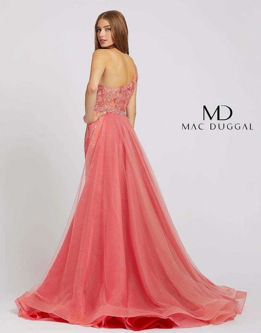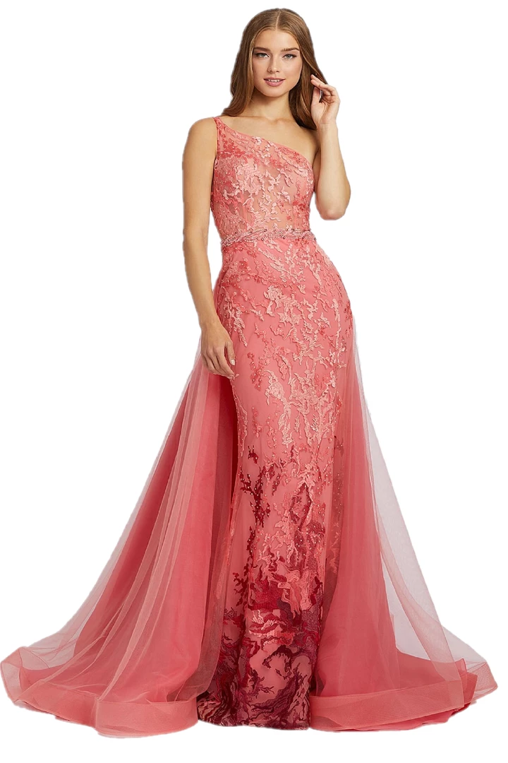 Mac Duggal 79290M – 79290 Be a showstopper in this captivating light coral mermaid gown. Style 79290M has a lace overlay, asymmetrical neckline, embellished belt, and a caped overskirt to create a dramatic look. Celebrate your night in style wearing this beautiful dress. This Mac Duggal Prom Collection 79290M light coral prom gown is fashioned in beaded ombre embroidery, with an illusion bodice and one-shoulder neckline. A beaded rope waistband accents this fitted formal dress, finished with a tulle overskirt that flows to a horsehair hem and semi-chapel train. Sequins are sparkling back into style on this Evening Gown by Mac Duggal Prom 79290. This long dress is embellished with embroidery throughout and it parades long sheath silhouette. A tulle overskirt is put at the back for a voluminous skirt and sweep train for a more memorable walk. This fabulous design by Mac Duggal brings a striking look meant to turn heads.