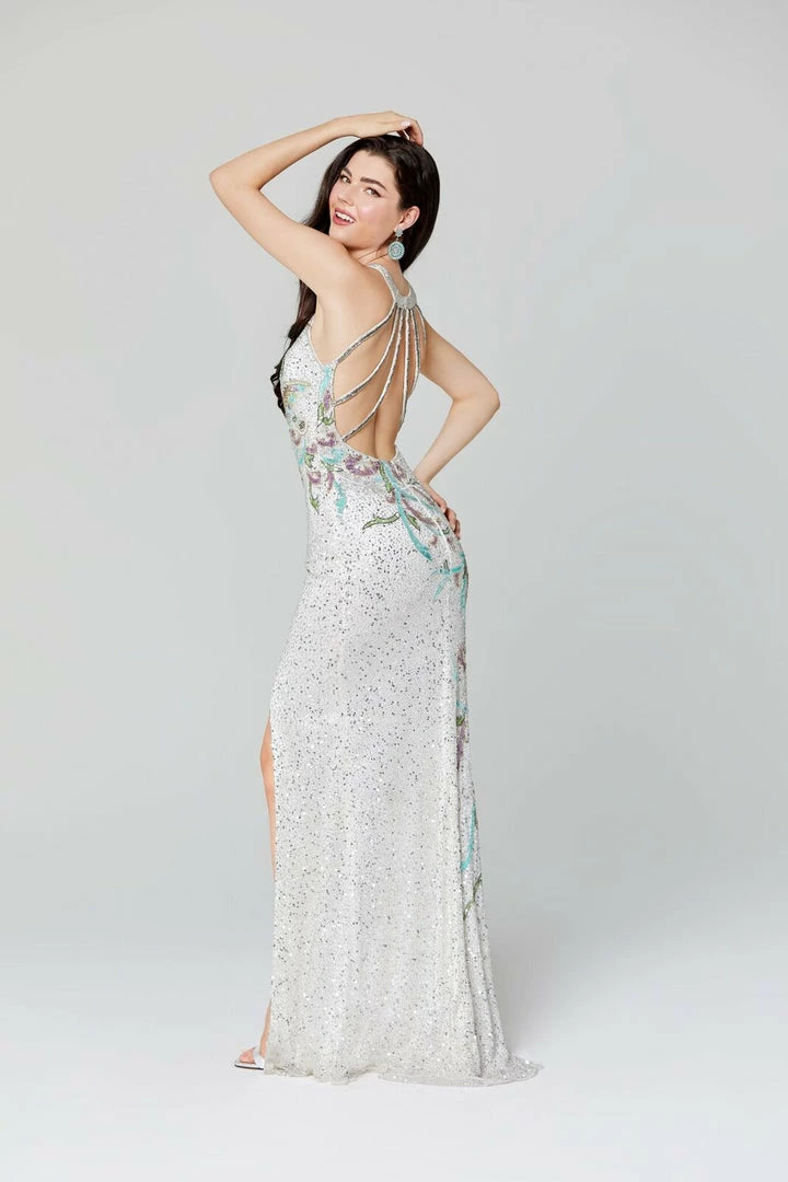 Primavera Couture 3420 high neckline prom dress with multiple straps that cascade across the open back sequin beaded evening gown. Formal long dress ball or gala dress.