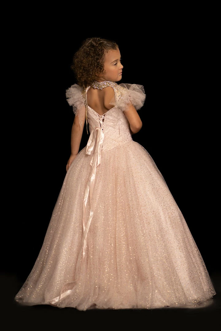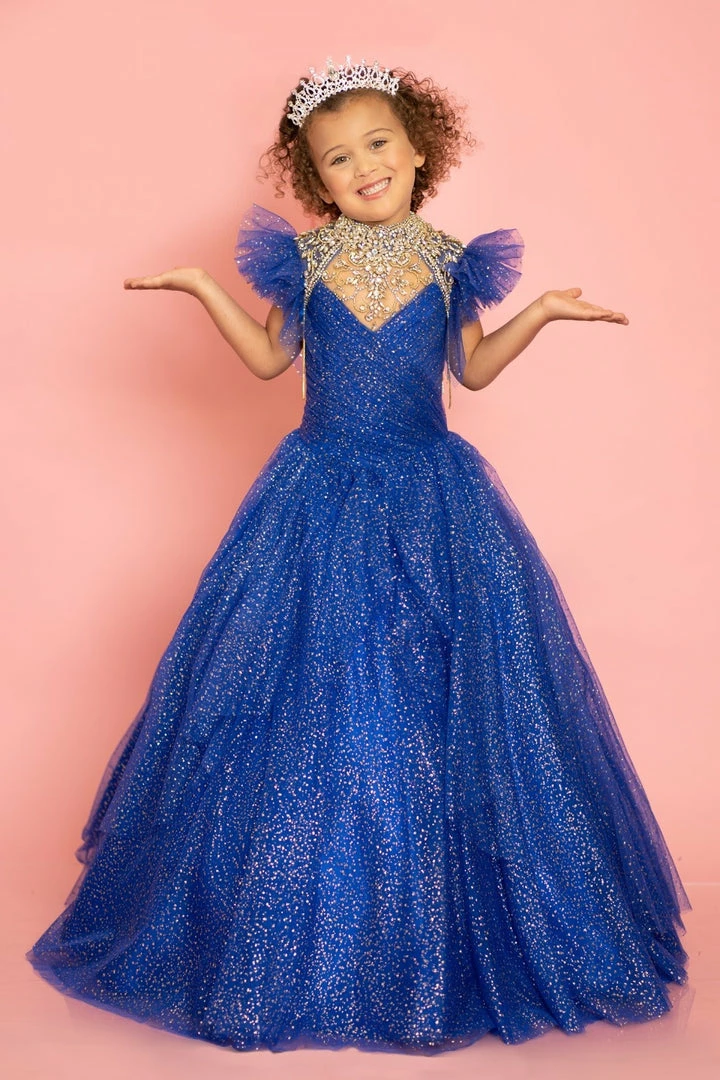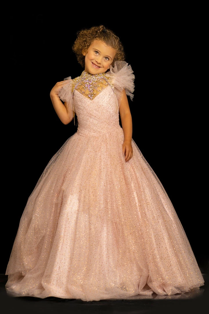 Sugar Kayne C106 by Johnathan Kayne This is a Stunning Glitter Embellished Tulle A Line Layer Pageant Dress. The Center Piece of the Gown is the Stunningly Detailed Crystal Embellished Neckline falling into the V neckline of the Pleated asymmetrical Bodice.