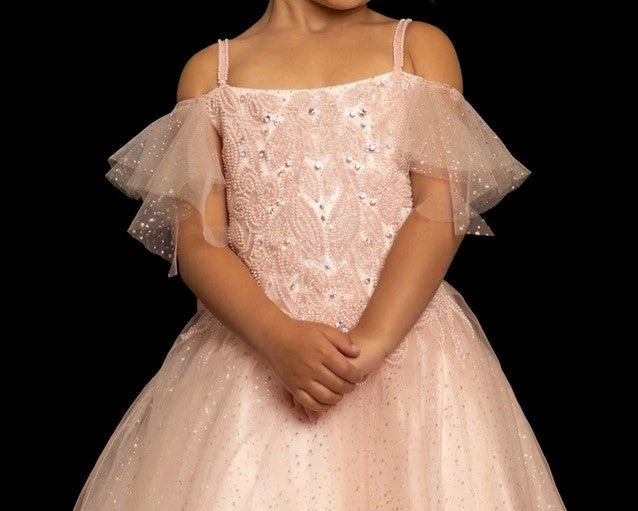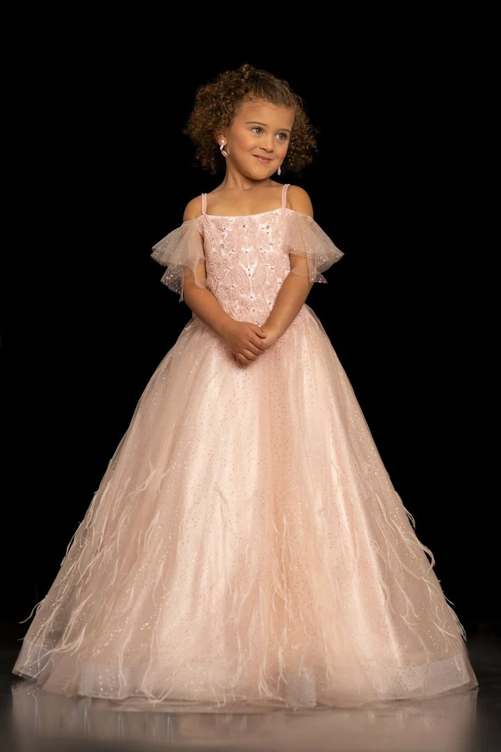 Sugar Kayne C109 by Johnathan Kayne is a Gorgeous Girls Pageant Dress Featuring tulle mesh fabric with Glitter embellishments scattered throughout. Embellished & Beaded floral bodice with classic off the shoulder tulle straps that are removable. Embellished spaghetti straps. This lush A Line ballgown skirt features cascading Ostrich feathers into the horse hair trim edge.