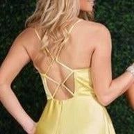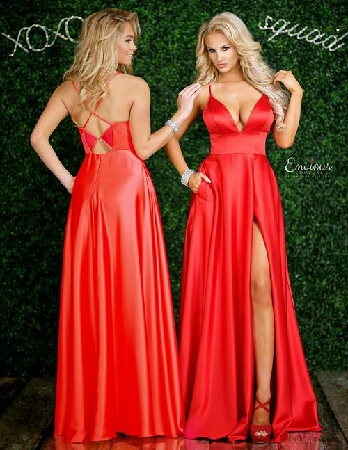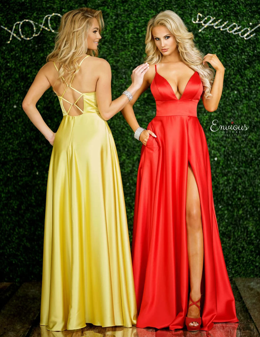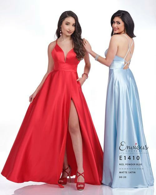 Envious Couture E1410 Karishma Creations is a Long Prom Dress, Pageant Gown & Formal Evening Wear. This Gown is a Long A line Matte Satin Prom Dress with a Deep V Neckline and open back with strap pattern. Pockets accentuate the front slit in the skirt! E 1410