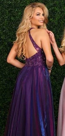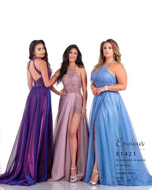 Envious Couture E1421 is a Long iridescent Prom Dress. Featuring a sweetheart Neckline under a sheer high neckline with Embellished appliques. Open Mid rise back with sheer Embellished straps. Skirt features an Iridescent Shimmer Fabric with a side slit for that Exquisite shine at any Event!Â