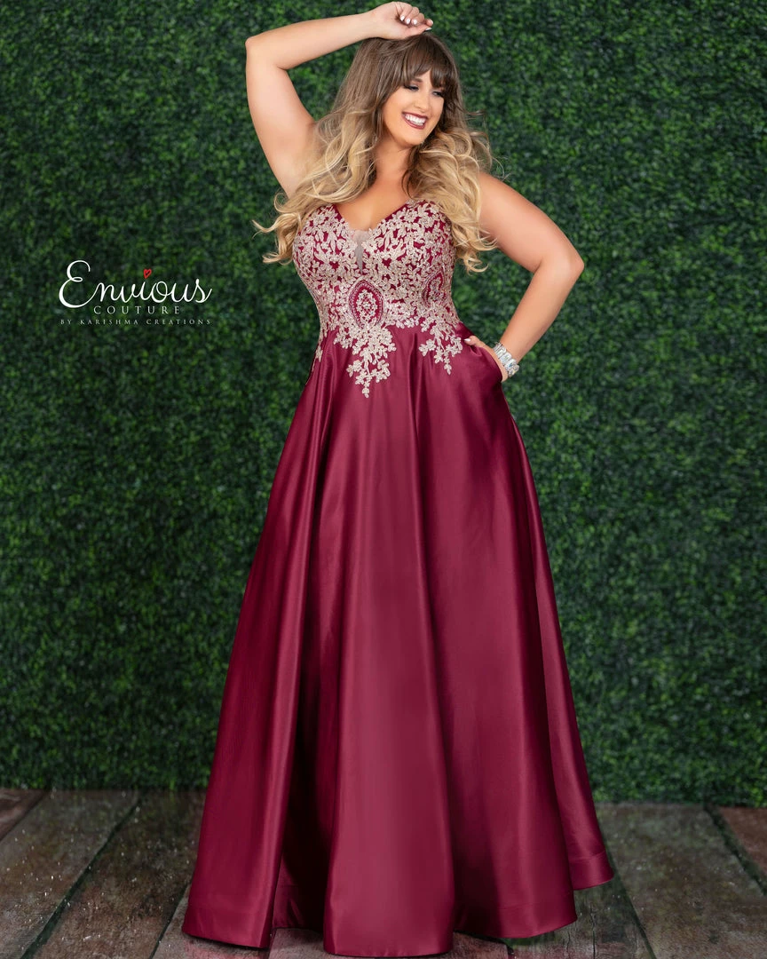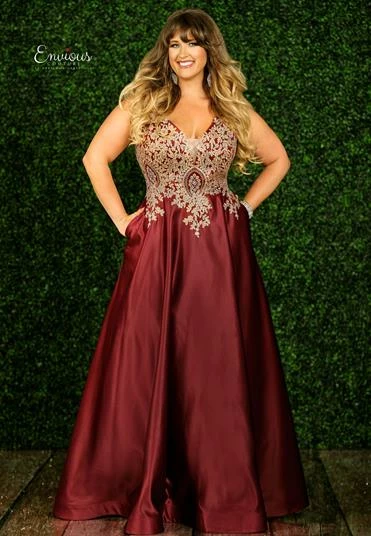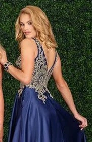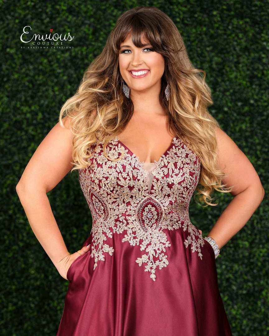 Envious Couture E1512 is a Long Satin Prom, Pageant & Formal evening dress. Featuring embellished Applique Accents along the Bust & Bodice, Plunging neckline with mesh insert. Open v back. High waist a line skirt with beaded appliques cascading into the satin skirt. E 1512