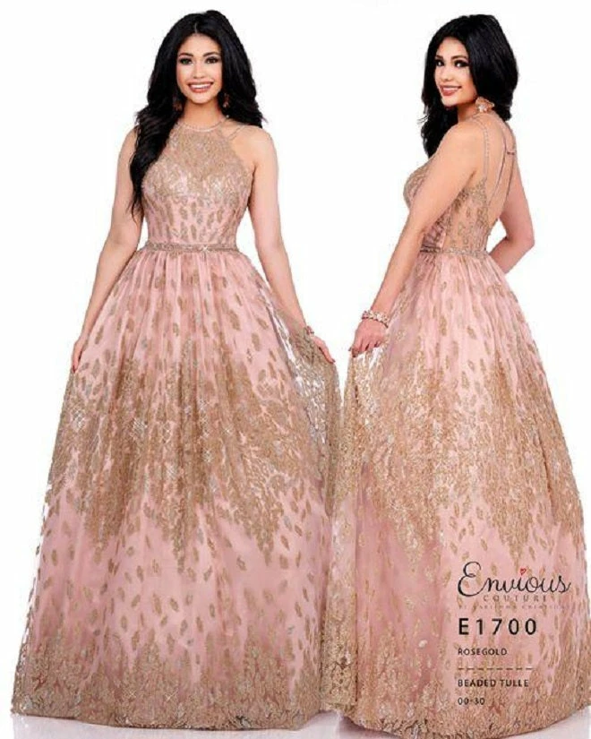 Envious Couture E1700 Prom Dress, Evening Gown. This is an exquisite prom evening dress. It is beaded throughout the long dress. The neckline is beaded sheer high with two spaghetti straps to the back. It has a sheer beaded back with a connecting strap on the inner spaghetti straps. The beaded ballgown is gathered at the waistline and has an embellished belt.