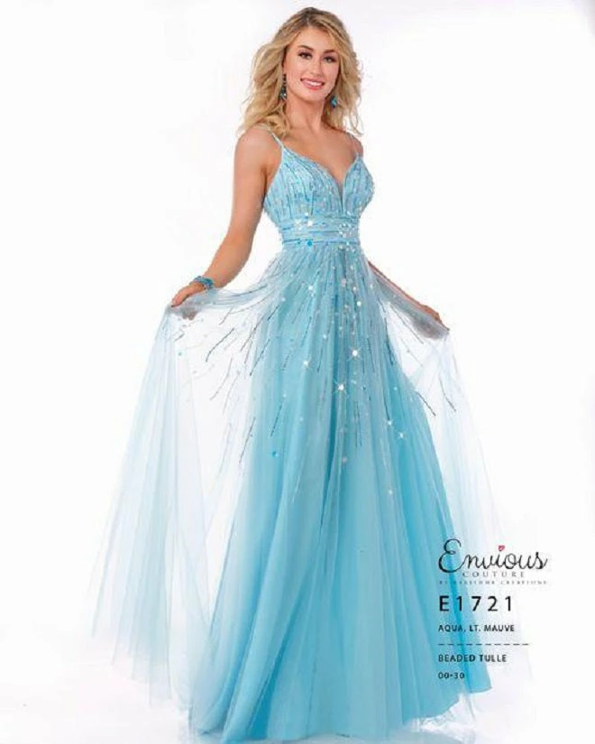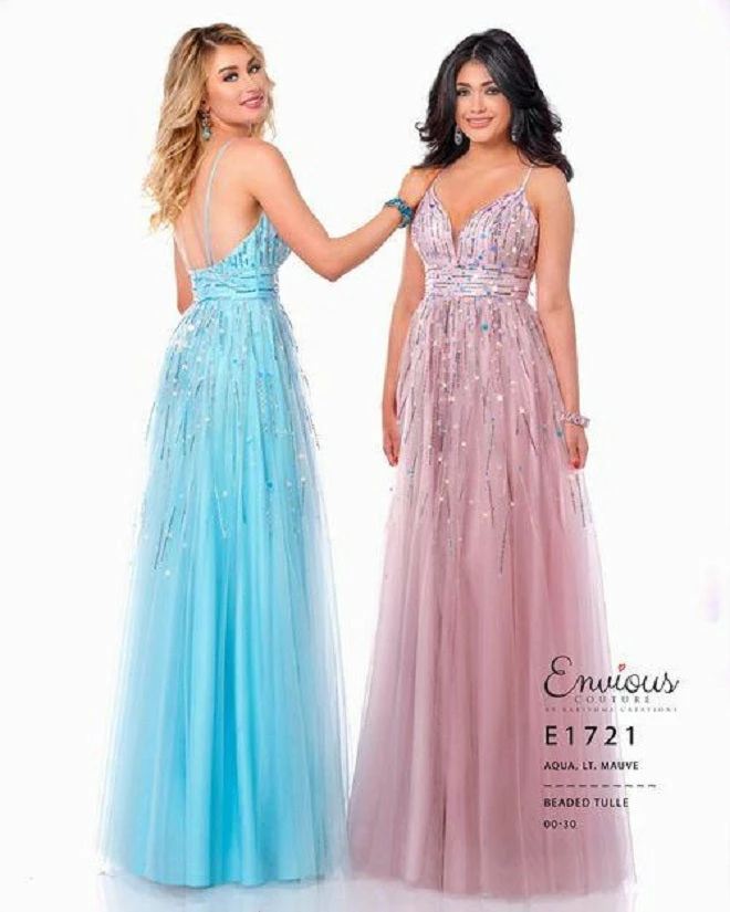 Envious Couture E1721 Prom Dress, Pageant Gown. Stand out from everyone else in this unique prom dress. It has a v neckline with an A line skirt. It features streams of beaded sequins flowing down the skirt. Excellent choice for Pageants.