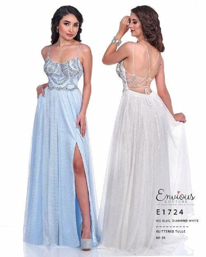 Envious Couture E1724 Ice Blue Prom Dress, Evening Gown.Β This beautiful evening dress has a crystal embellished bodice and double spaghetti straps that wrap over the shoulders and crisscross and tie in the back.Β The skirt is in an A line shape and is made of tulle with a side slit.