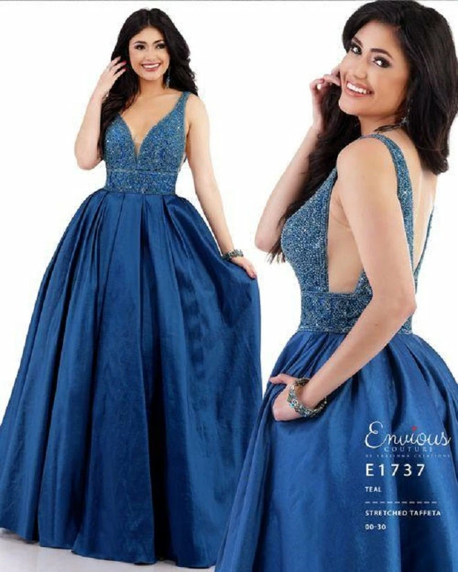 Envious Couture E1737 Teal Prom Dress, Evening Gown. This is a gorgeous ballgown with an embellished top and back with a wide embellished waistline. It has a V neckline with sheer panels at the neckline and under the arms. The stretch taffeta long skirt is pleated at the waistline.