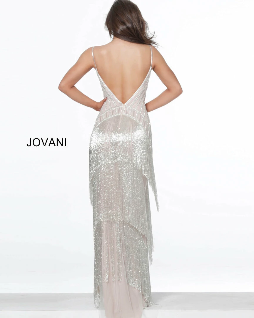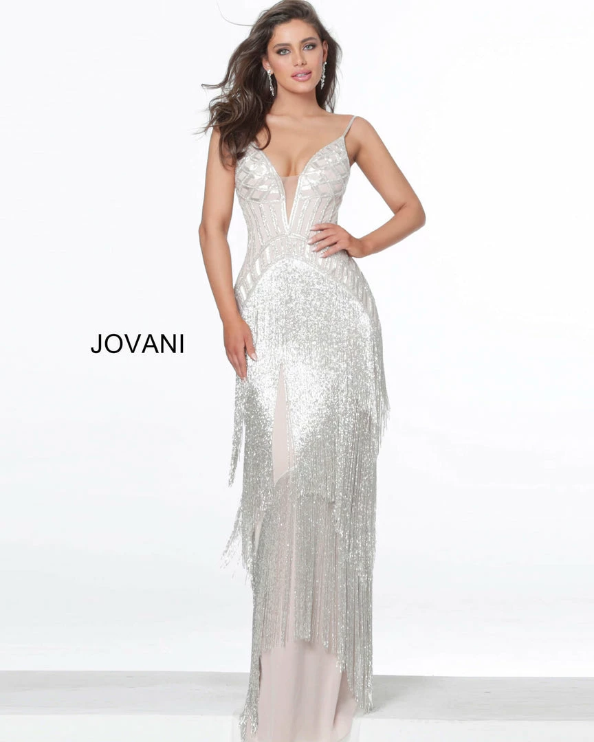 Jovani 8101 This evening gown is a silver nude prom dress features a fitted silhouette with linear sequin beadwork on the bodice and tiered fringe trim along the long skirt.  Spaghetti straps support the mesh insert plunging neckline and the open V-back. Make a statement at your next pageant or special event.Â