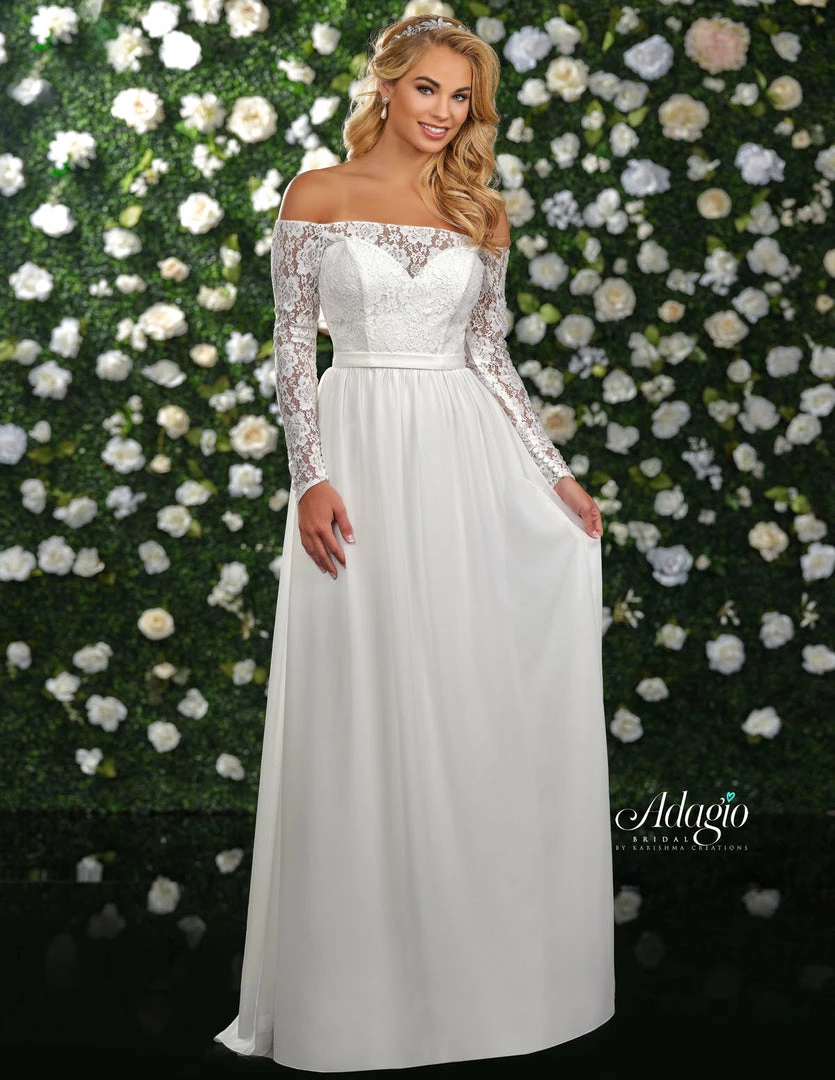 Adagio Bridal D9237 is a long Flowing Chiffon and Lace wedding dress with a Sheer Lace Illusion straight Neckline and sweetheart neckline top. Features Off the shoulder long lace Sleeves.