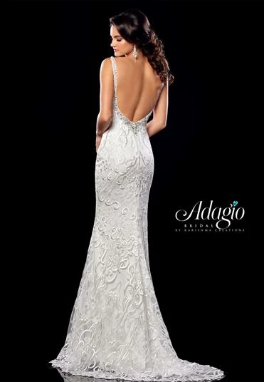Adagio Bridal W 9289 Long Fit & Flare Lace Embellished wedding dress. Featuring a beaded & Embellished V Neckline with Crystal edged straps and open V Back. Backless dress. Mermaid with sweeping train.