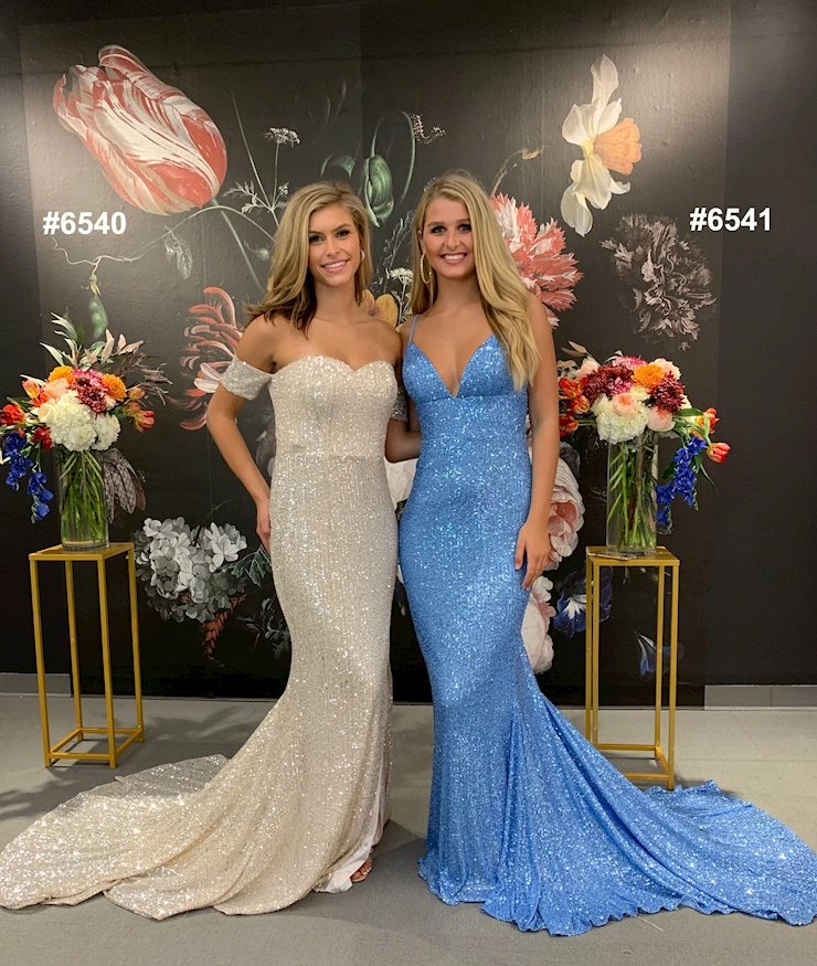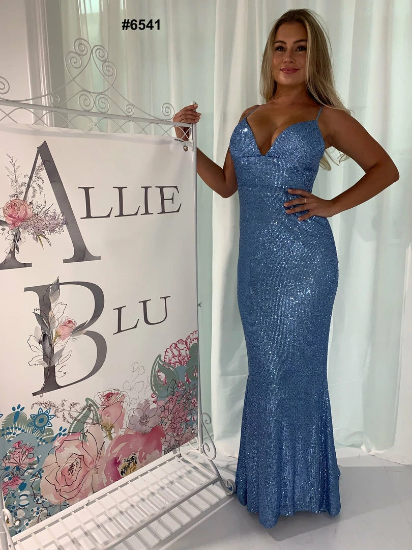 Allie Blu 6541 Baby blue v neckline fitted sequins prom dress with train