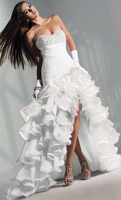 This ruffled high-low evening dress is sizzling hot. The ruffled skirt cascades into beautiful layers of organza and is accented with a high slit, making this dramatic high low style a true showstopper. Two tone jewel accents fully trim the top of the ruched bodice and the ruching hugs down to the hips in a dropped waist style. Perfect for prom or pageant and bound to turn heads, this dress is perfect for you!
