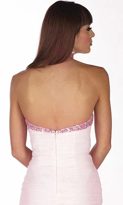 Stunning prom gown with sweetheart hand beaded bustline. Pleated bodice, ruffled skirt and high center slit.