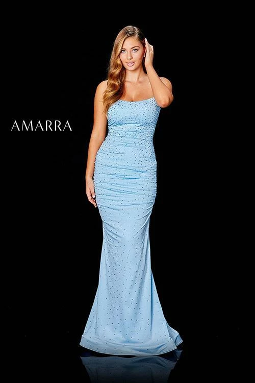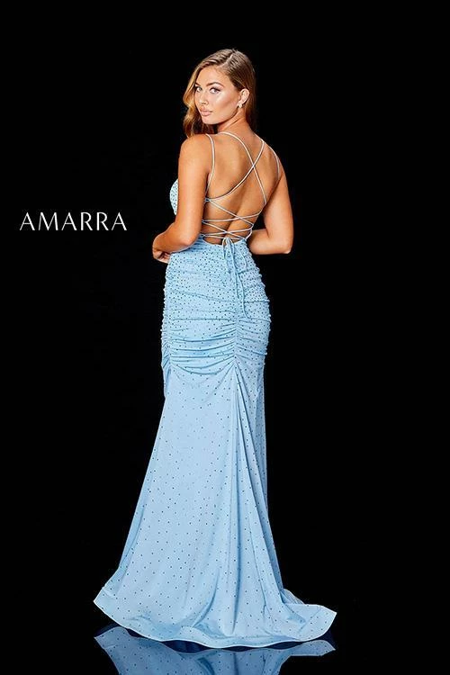 Amarra 20074 Long Fitted Ruched Prom Dress Formal Backless Gown Classic in the front, party in the back! Style 20074 features a scoop neckline and delicate ruching for an elegant look. The lace up back offers a dose of boldness that will be hard to ignore.