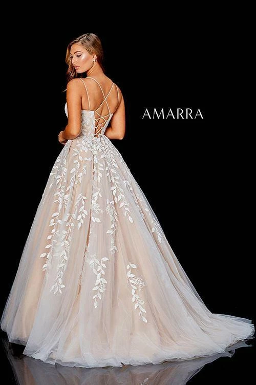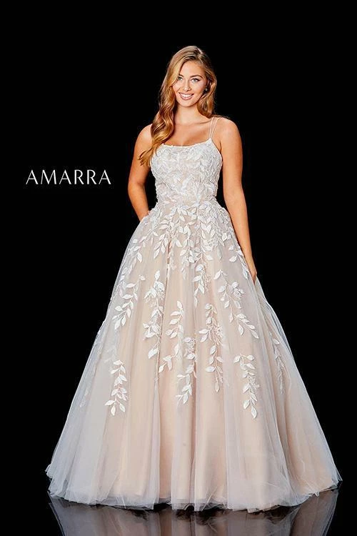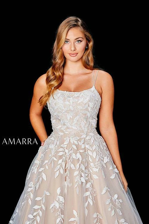 Amarra 20102 Long A Line Lace Ball Gown Prom Dress Formal Wedding Corset In this soft tulle ball-gown, it’s impossible not to feel like you’re floating on cloud 9. This dress features a classic scoop neckline and embellished bodice. Lace details tumble delicately onto the full skirt.