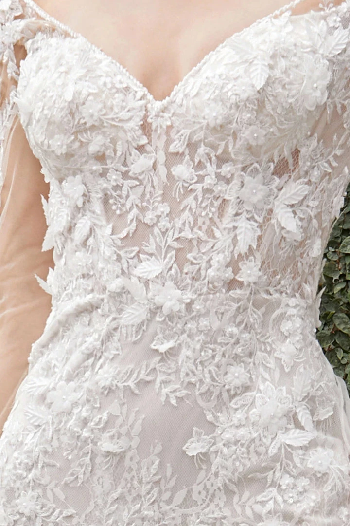 Andrea & Leo Couture GISELLE A1073 Lace Long Sleeve Mermaid Wedding Dress Bridal Gown Giselle is the dream bohemia. It features a beautiful lacework with 3D blossoms appliqued over chantilly lace. Brides looking for sleeves will love the sheer sleeve with ruffle cuff & flattering lace placement along the outer arm. Wide V neckline with delicate beading is breathtakingly romantic as it continues into a sheer deep U back with waist slimming lace placement.Â