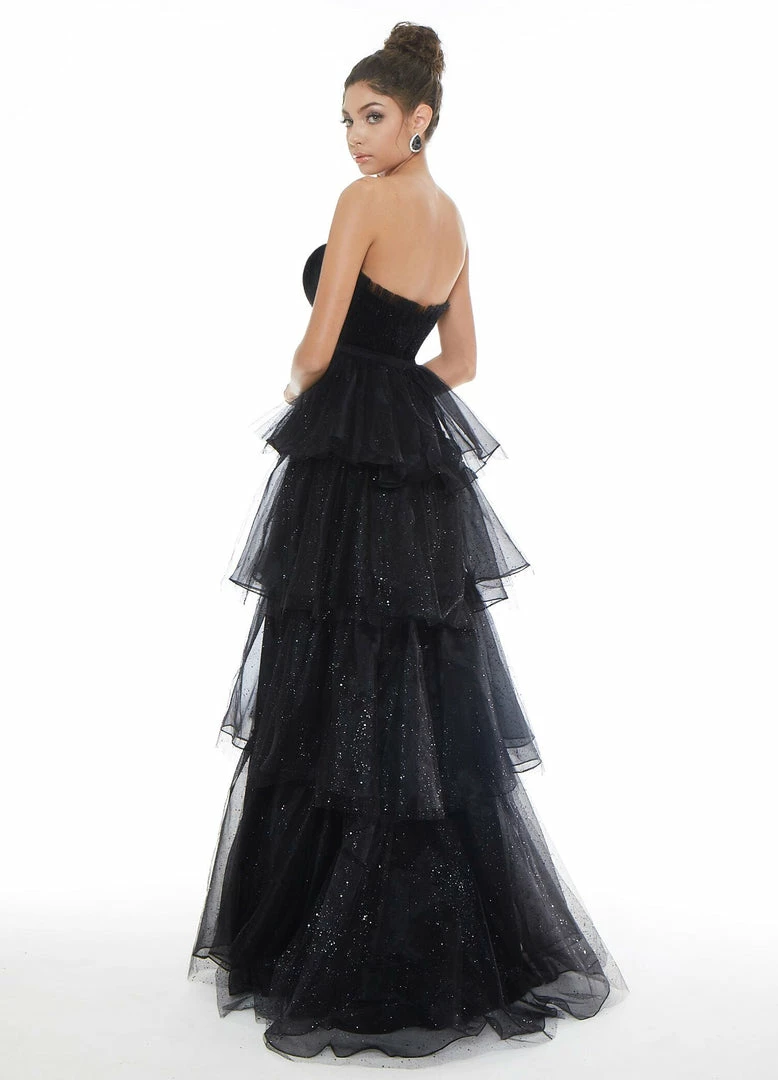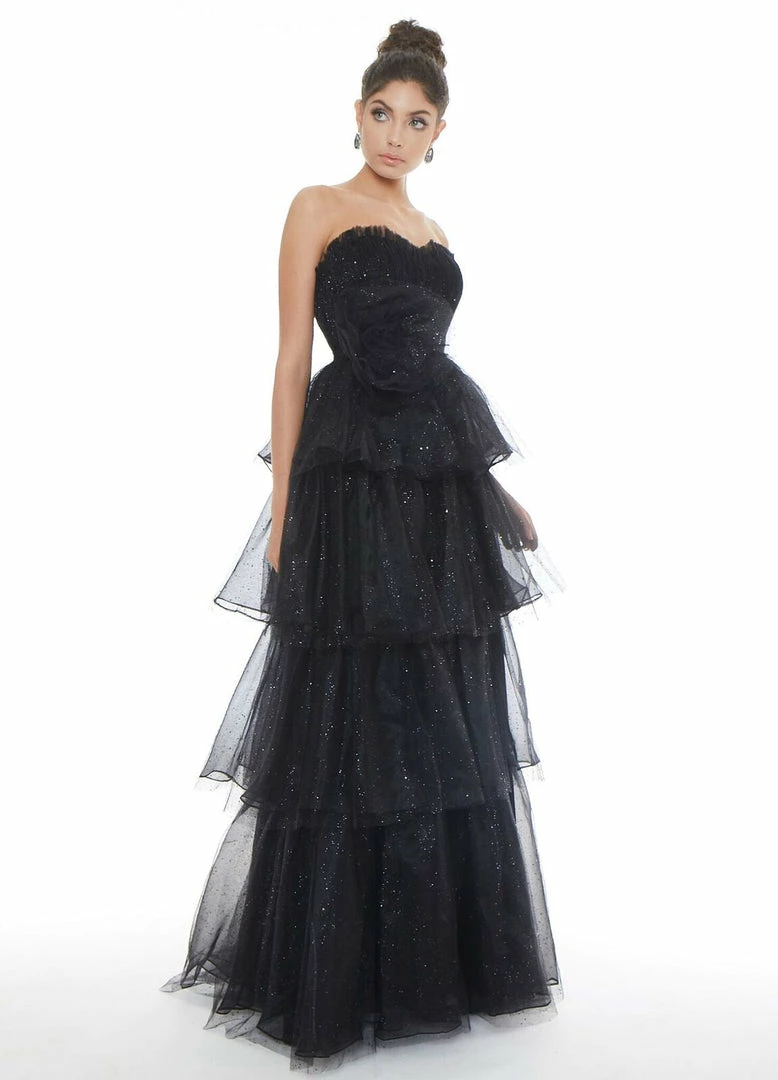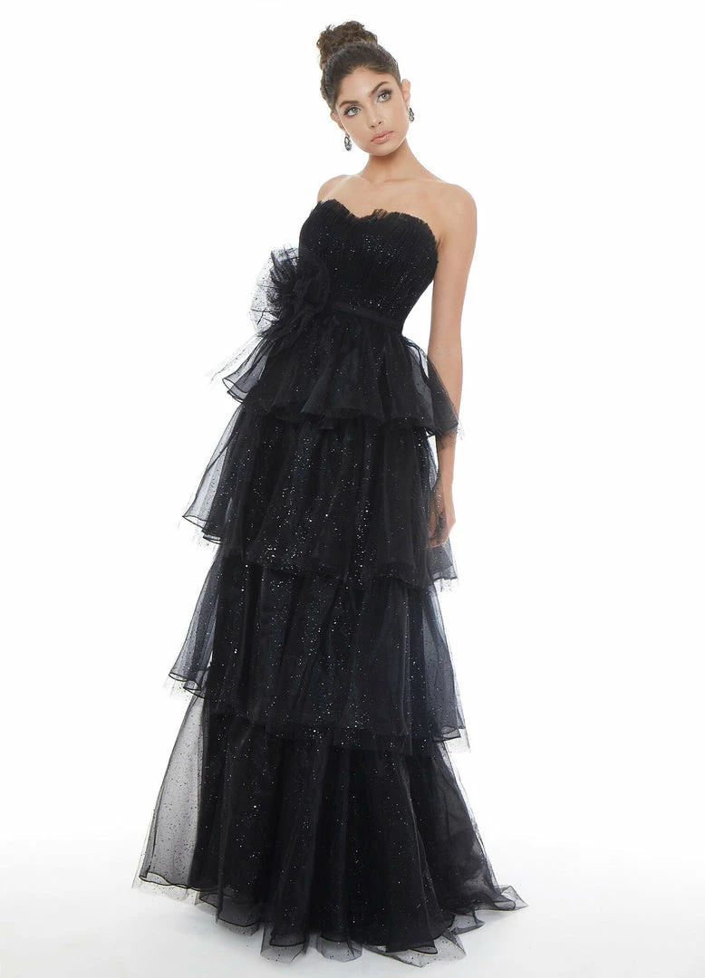 Be chic and sophisticated in this strapless gown that is finished with trendy tiers. The waist is accentuated with a tulle belt and floral details.
