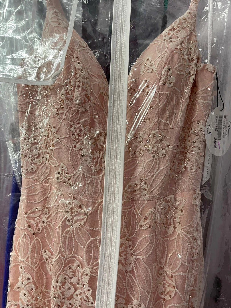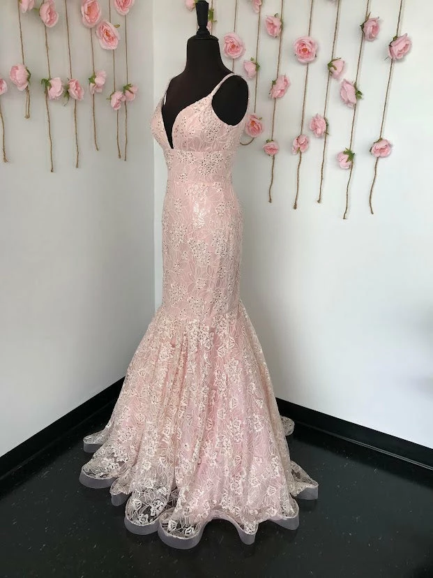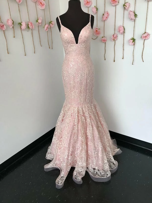Ashley Lauren 1743 Long Lace formal Mermaid Prom Dress with clear petite sequins and crystal rhinestone accents. v neckline with a solid lace base. Great pageant Gown