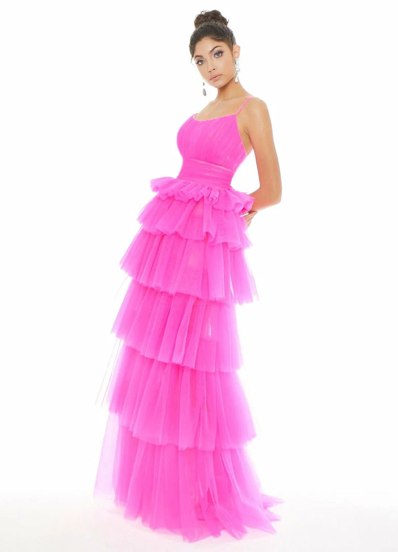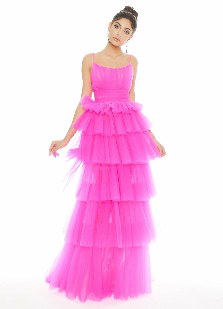 Show off your dramatic side in this stunning tiered gown. This gown features spaghetti straps, a gathered bustier and soft tulle tiers!