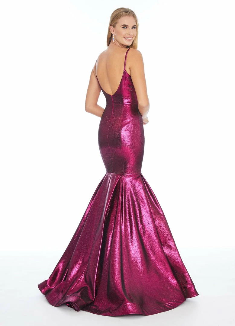 Metallic madness! Metallic is all the rage this season. This V-neck spaghetti strap gown complete with a fit and flare skirt is sure to stand out.