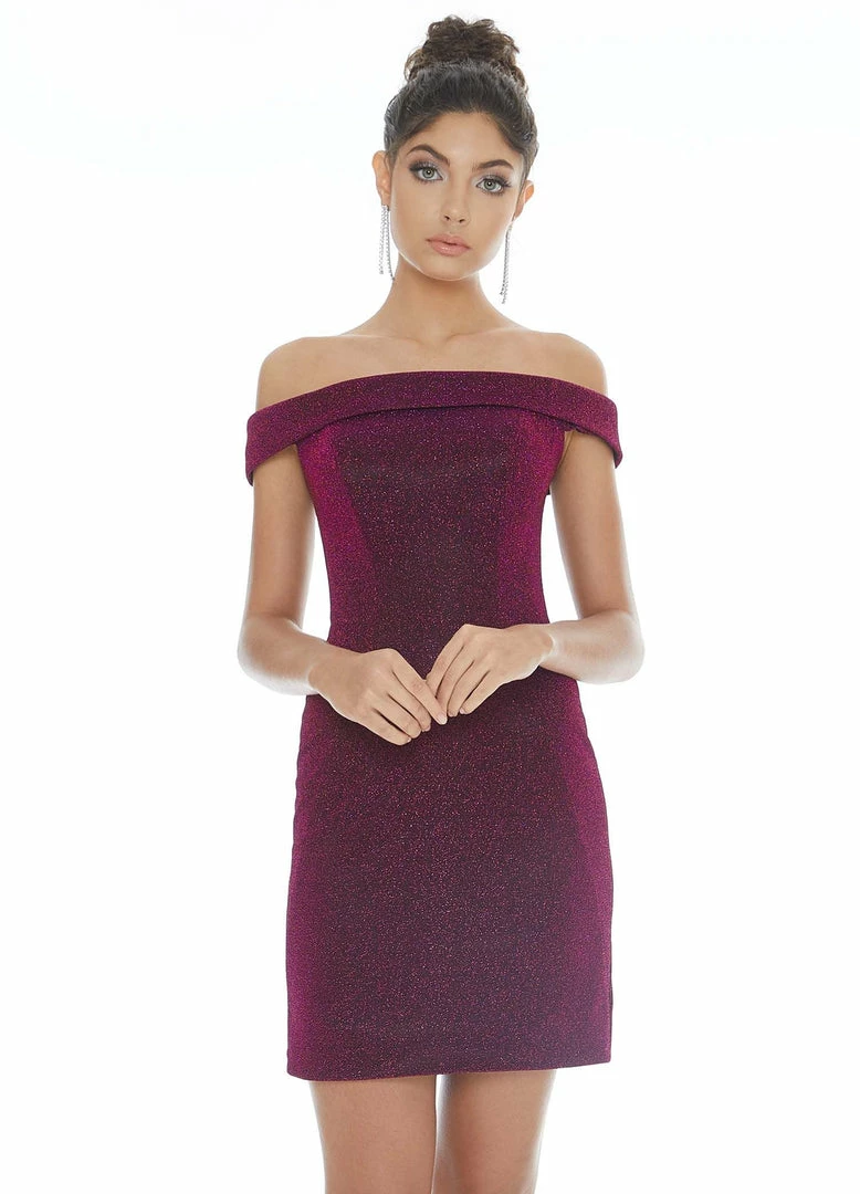 Ashley Lauren 4240 This off the shoulder straight neckline fitted glitter short cocktail dress, homecoming dress and pageant wear dress is made of shimmery metallic scuba for a smooth fit. The off the shoulder neckline perfectly frames your face while the fitted skirt accentuates your curves.