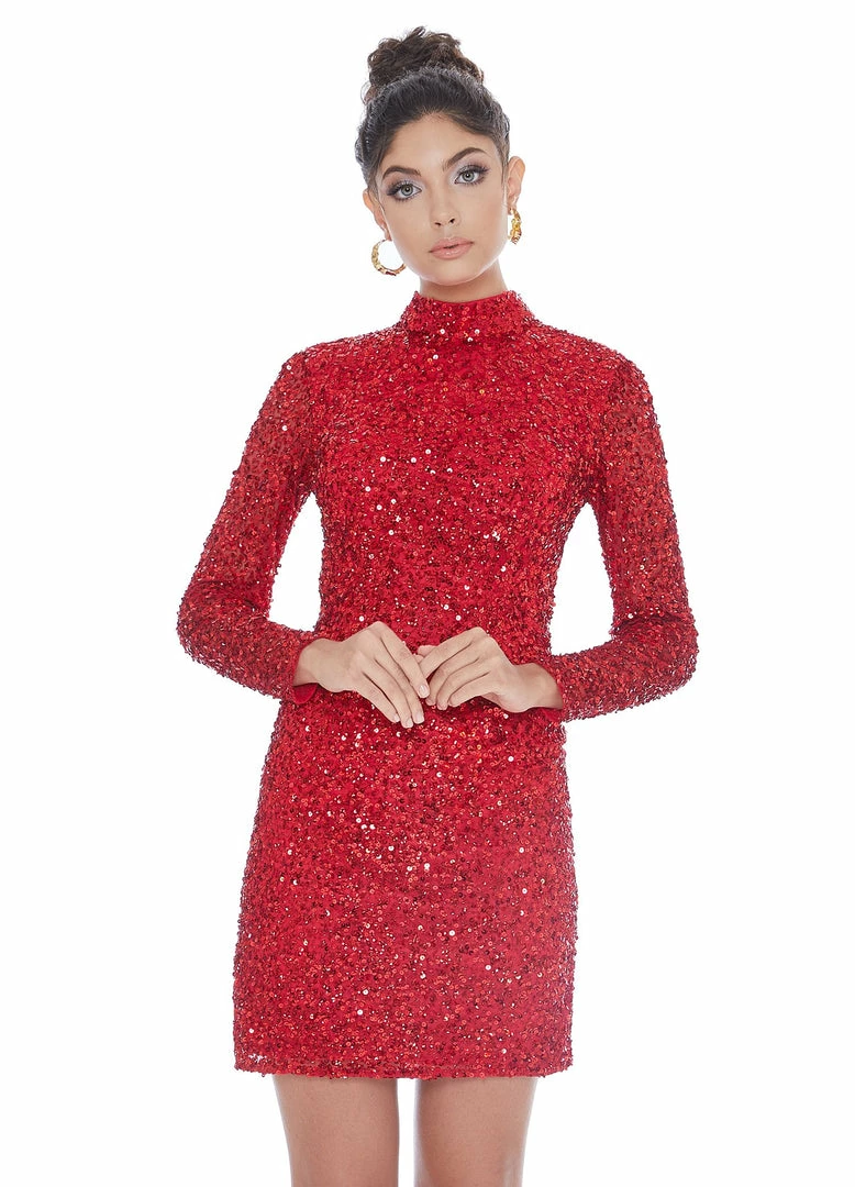 Ashley Lauren 4252 Cocktail Dress. This is a long sleeve sequin beaded short fitted cocktail dress with a high neckline and circle cutout back.Â