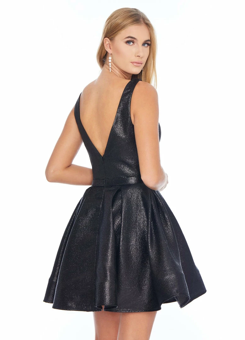 Ashley Lauren 4325 v neckline metallic shimmer short homecoming cocktail dress short prom dress plunging v neckline wide waistband v back fit and flare a line short skirt