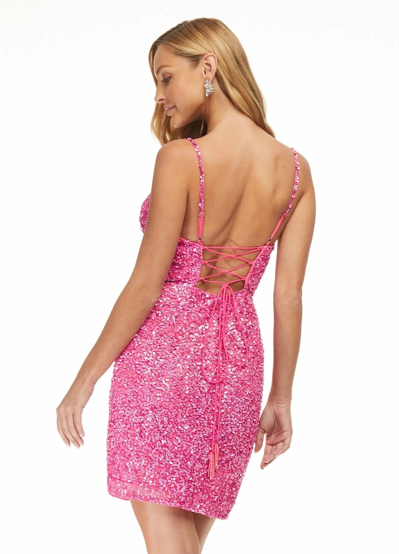 Ashley Lauren 4436 Ultra Pink Cocktail Dress. Wow the crowd in this super ultra pink short cocktail dress. The dress is fitted with hand beaded sequins throughout with a wide waistband. The neckline is a V shape and it has an open corset tie back. This is the perfect dress for your homecoming dance.