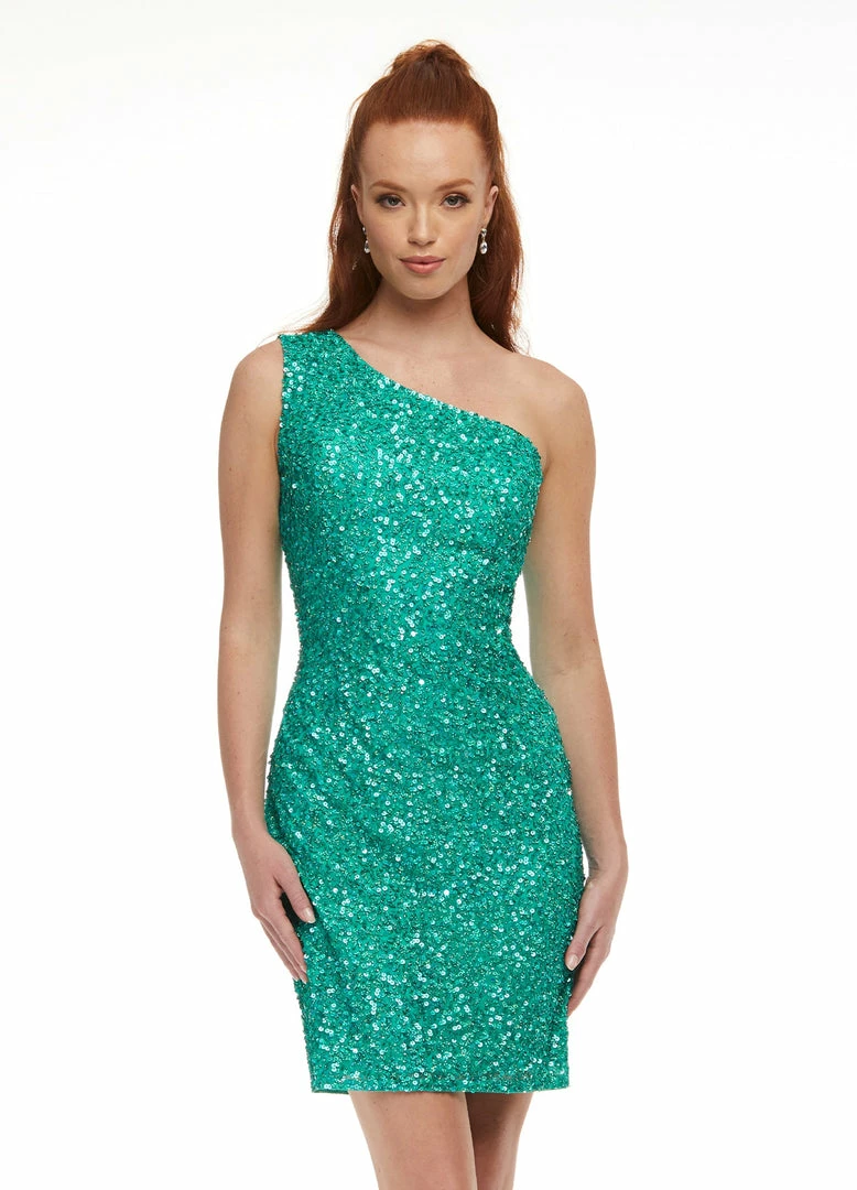 Ashley Lauren 4469 Jade Cocktail Dress. This unique fitted short dress is made sequins. It has an asymmetrical cutout back that has a lace up tie corset. Look marvelous in this short reception dress, pageant or homecoming dress.