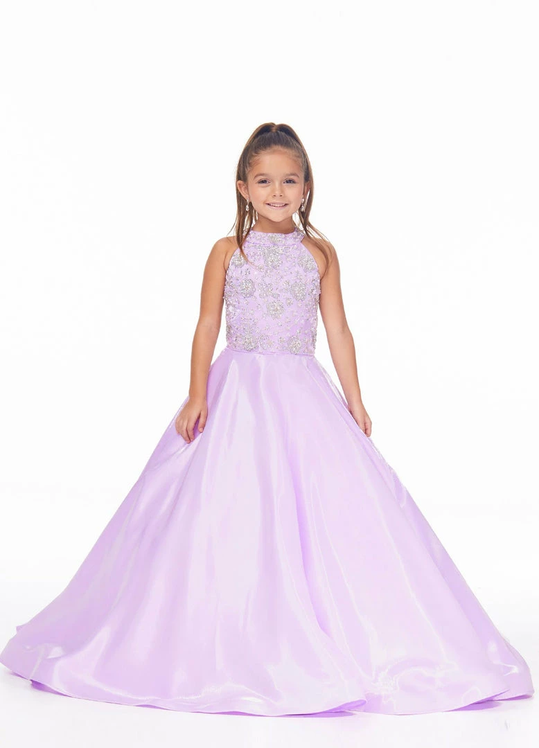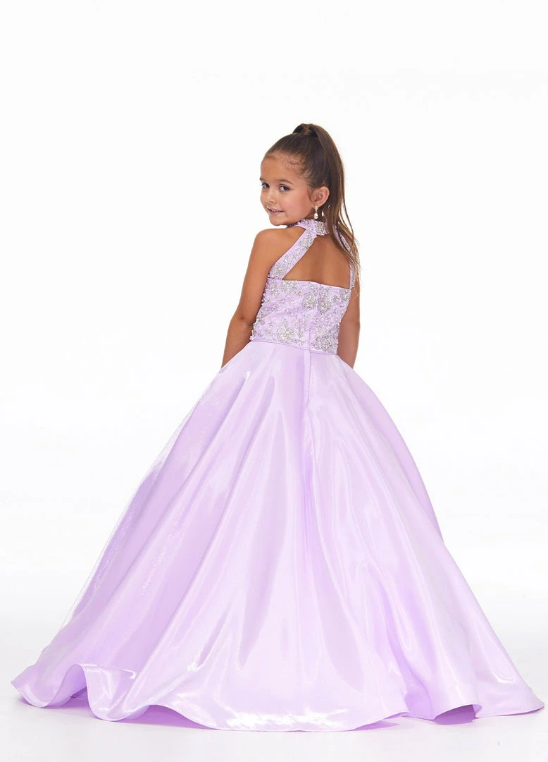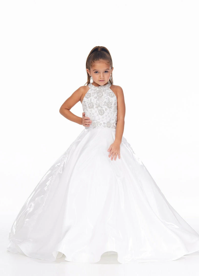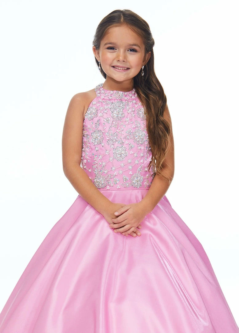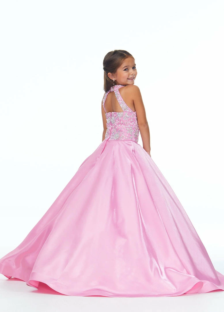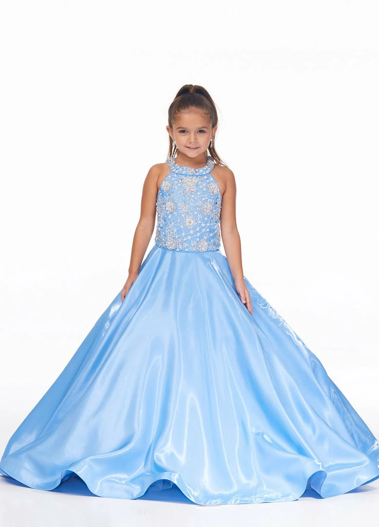 Ashley Lauren 8050Â Elegant halter kids, girls and preteen’s shimmer satin pageant gown featuring a pearl and crystal beaded bodice accented by full shimmer satin skirt.