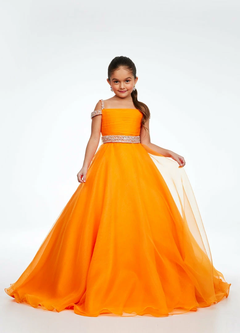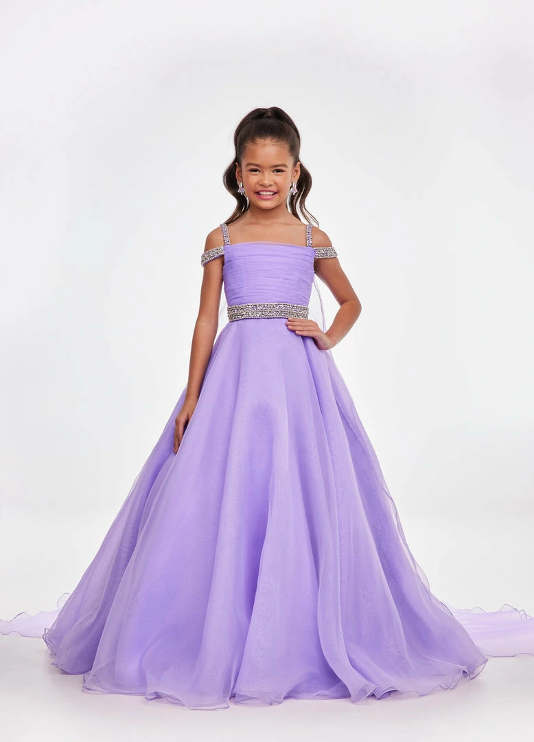 Ashley Lauren Kids 8094 Long off the shoulder A Line Pageant Ball Gown Pageant Dress We are obsessed with this kids evening gown! This organza ball gown features crystal encrusted straps giving way to a ruched bustier. The same crystal detail accents the elegant beaded belt. The look is completed with an A-Line skirt and attached organza cape. Ruched Bustier Crystal Strap & Belt Organza Ball Gown Skirt Organza Cape