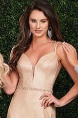 Envious Couture E1562 by Karishma Creations is a Long Shimmer Prom Dress Featuring a Shimmer Jersey for a touch of glam to this deliciously simple style. Plunging neckline with crystal embellished waist belt. Spaghetti straps with an open lace up back. Slit in the skirt. Sheer Mesh Side cutout panels. Formal Pageant Dress Evening Gown E 1562