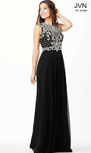JVN31435 Gorgeous sleeveless prom dress features a crystal and bead embellished top with an open back and flowing chiffon skirt.  Long Fitted Cutout Formal Dress Sheer Back High Neck