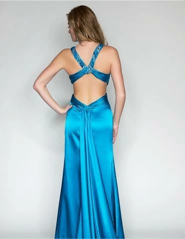 Hand beaded criss cross low back charmeuse dress with fully beaded bust and back detail. Stunning gown with small train and slit.