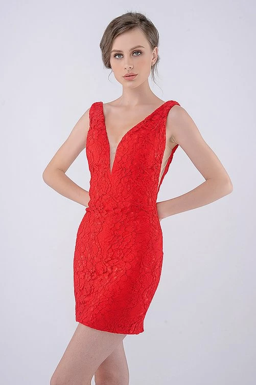 Nina Canacci 266 is a short fitted formal lace cocktail dress. Featuring a V neckline and sheer mesh side panel sides. This simple & Elegant style is perfect for any formal or semi formal event! Open V back.