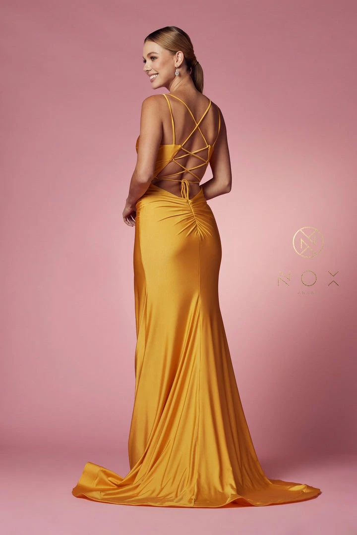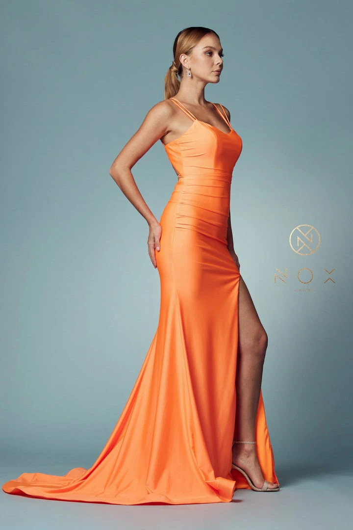 Nox Anabel T481 Long Fitted Jersey Prom Dress Backless Corset Slit Formal Gown Train Sleek and chic with a lightweight feel, this gorgeous scoop neck with spaghetti straps fitted gown by NOX ANNABEL is as cool as it is comfortable. A gently scooped neckline pairs perfectly with thin straps, highlighting the face with an open wide neck bringing a touch of luxurious, effortless texture with the soft scoop detail. This beautiful mermaid gown adorns a side slit that finishes to full length. The open back is secured with crisscross straps.