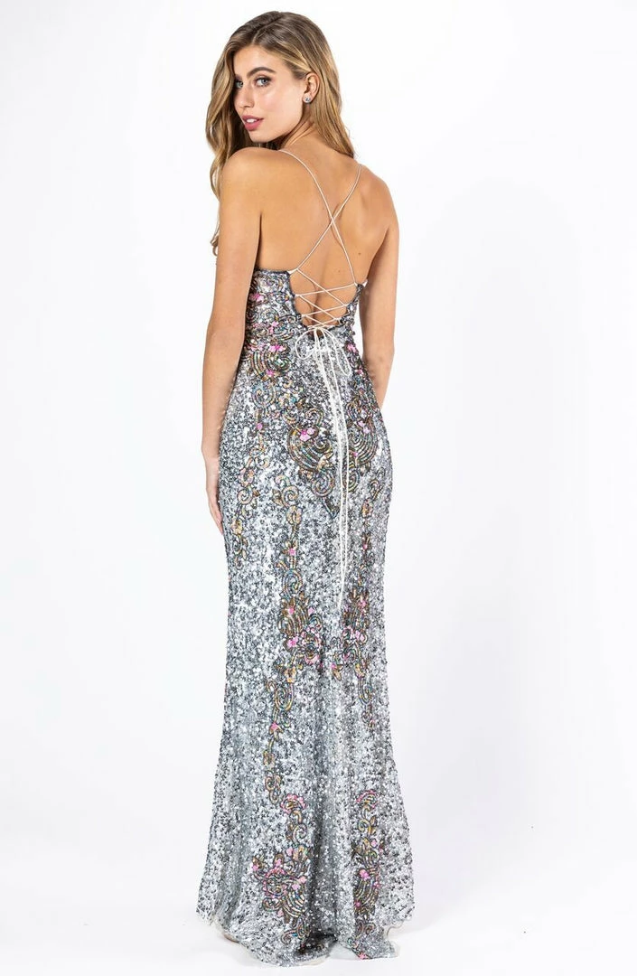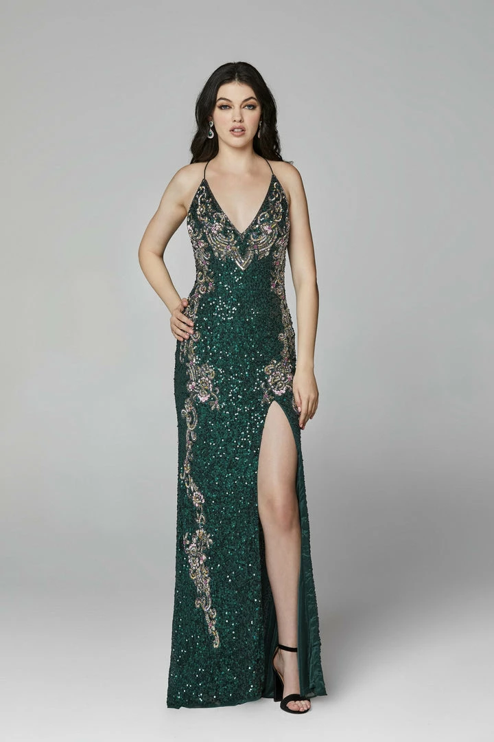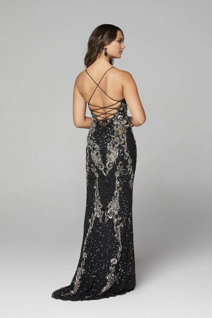 Primavera Couture 3211 is a Long fitted sequin Embellished Formal Evening Gown. This Prom Dress Features a deep V Neck with an open Corset lace up back. Beaded & Embellished elegant scroll pattern accentuate curves. Fully beaded prom dress with floral pattern and side slit. Long Sequin Gown featuring a v neckline. slit in the fitted skirt, Slit in Thigh. Stunning Pageant Dress, Prom Gown & More!