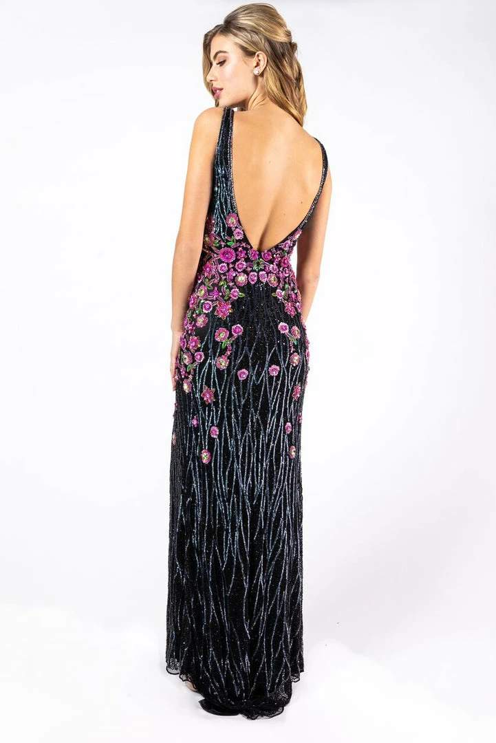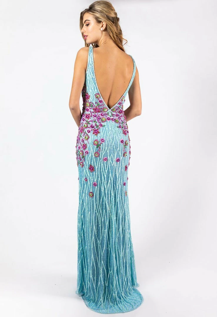 Primavera Couture 3238 Prom Dress Pageant Gown his fully beaded gown features thick straps, a side slit, an open back, and stunning floral beading at the waist than spreads toward the bottom.