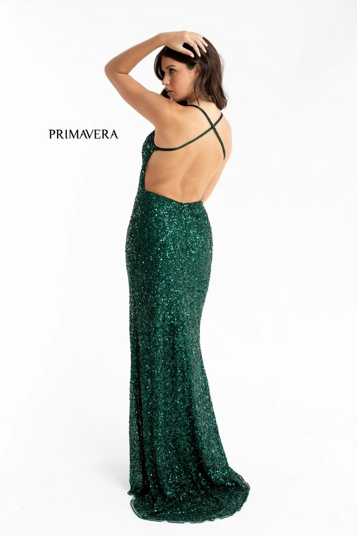 Be cool and calm in this purple prom dress. It is all sequins with a v neckline. The long skirt has a left side slit. Beaded spaghetti straps crisscross in the open back. Make this your prom dress.Â